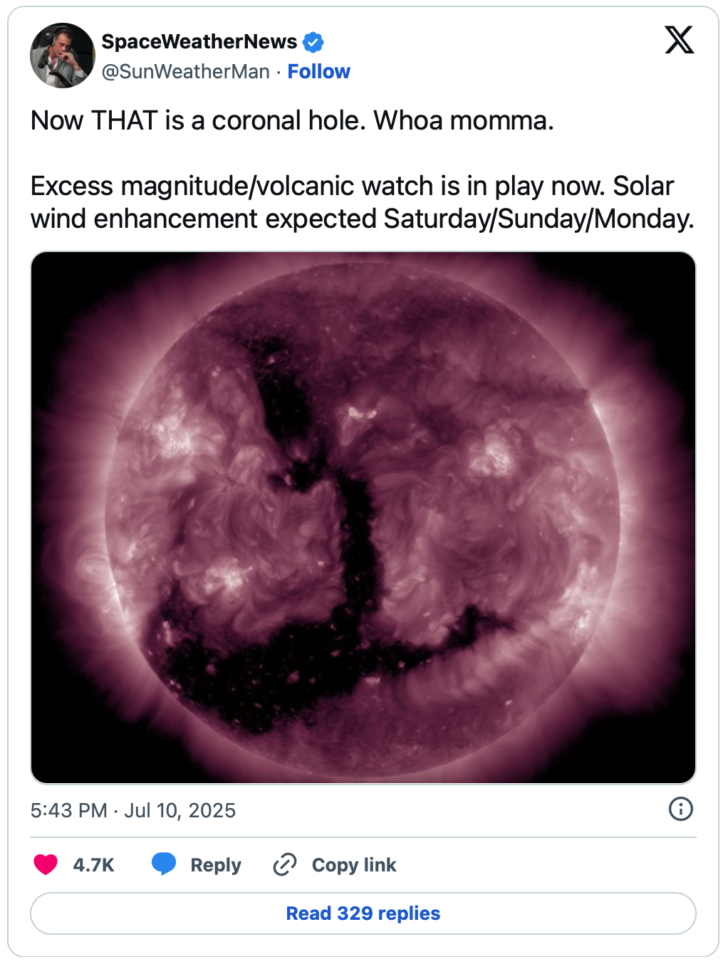Now THAT is a coronal hole. Whoa momma,” Davidson said, adding,”Excess magnitude/volcanic watch is in play now. Solar wind enhancement expected Saturday/Sunday/Monday.”
