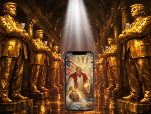 As journalist Peter Baker notes, Trump “regularly depicts himself in a heroic, almost godly fashion, as a monarch, as a Superman, as a Jedi knight, as a military hero, even as a pope in a white cassock.”