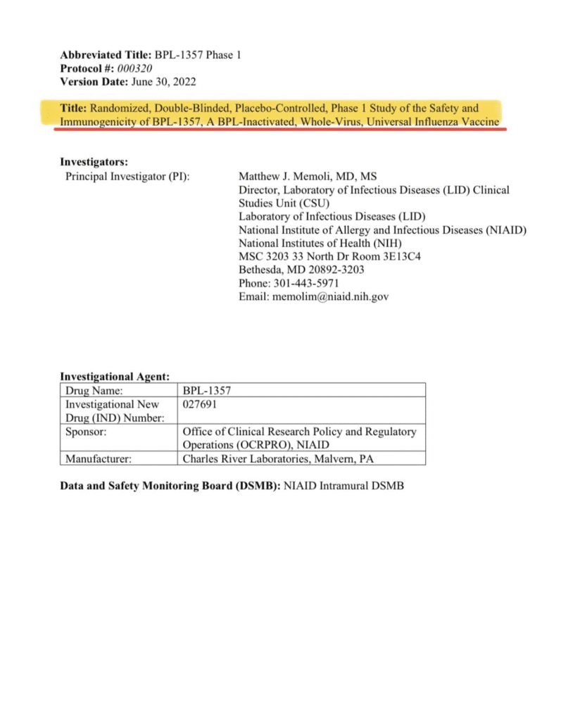 It’s called BPL-1357 – a beta-propiolactone inactivated, whole-virus “universal influenza” vaccine developed in-house at NIH’s NIAID.