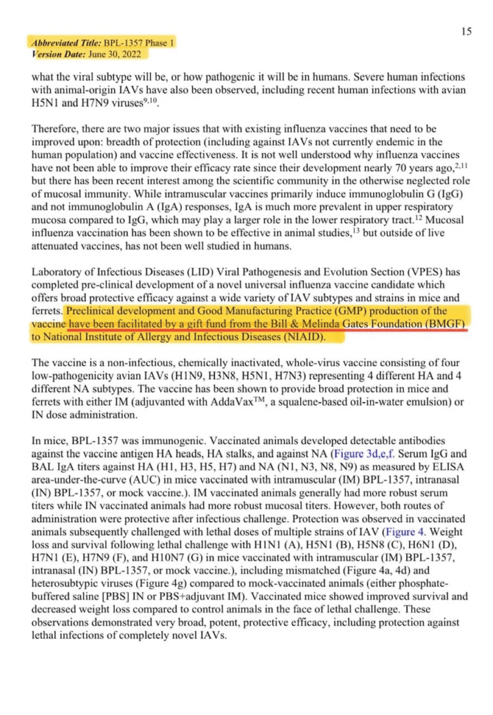 “This initiative represents a decisive shift toward transparency, effectiveness, and comprehensive preparedness, funding the NIH’s in-house development of universal influenza and coronavirus vaccines, including candidates BPL-1357 and BPL-24910. These vaccines aim to provide broad-spectrum protection against multiple strains of pandemic-prone viruses such as H5N1 avian influenza and coronaviruses including SARS-CoV-2, SARS-CoV-1, and MERS-CoV,” it continued.